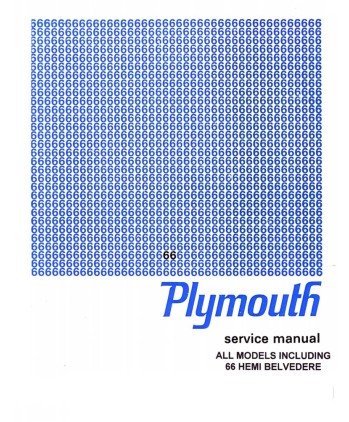 - This Repair Shop Manual offers a page-for-page reproduction of the bound manual that Plymouth mechanics used to service vehicles. It includes the 849 page "Plymouth 1966 Service Manual." You will find detailed service procedures for maintenance, lubrication, troubleshooting, front and rear axle, body, brakes, clutch, cooling system, engine, exhaust system, frame, fuel system, generator, ignition system, wheels, tires, universal joints, and transmission. With the step-by-step illustrated instructions, specifications, and wiring diagrams. You will have the information you need to get your project on the road and keep it there. The best part is that you can print out the pages you need, dirty them in the shop, and then throw them away. Great if you have a hard copy that you want to keep clean. You can use the information on this manual to restore all 1966 Plymouths, including Valiant, Signet, Barracuda, Belvedere (I, II), Satellite, Fury (I, II, III, Sport, VIP) Wagons.