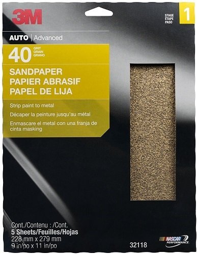 - Five sheets of 40 grit sandpaper designed to be used by hand sanding
